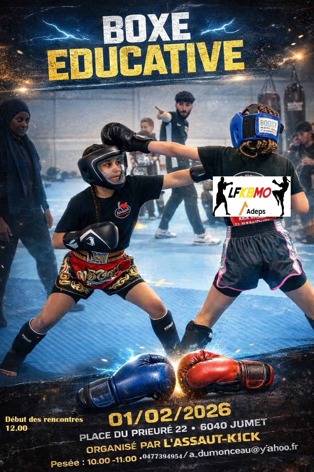 « Tous les Évènements Boxe éducative 1 février 2026 « Gala B Gala C » 3 surfaces + Google Agenda+ Exporter vers iCal Détails Date : 1 février 2026 Catégorie d’Évènement: Boxe éducative Organisateur L’assault Téléphone : 0477394954 E-mail : a_dumonceau@yahoo.fr Lieu Jumet Place du Prieuré 22 Jumet, 6040 Belgique + Google Map Téléphone : 0477394954