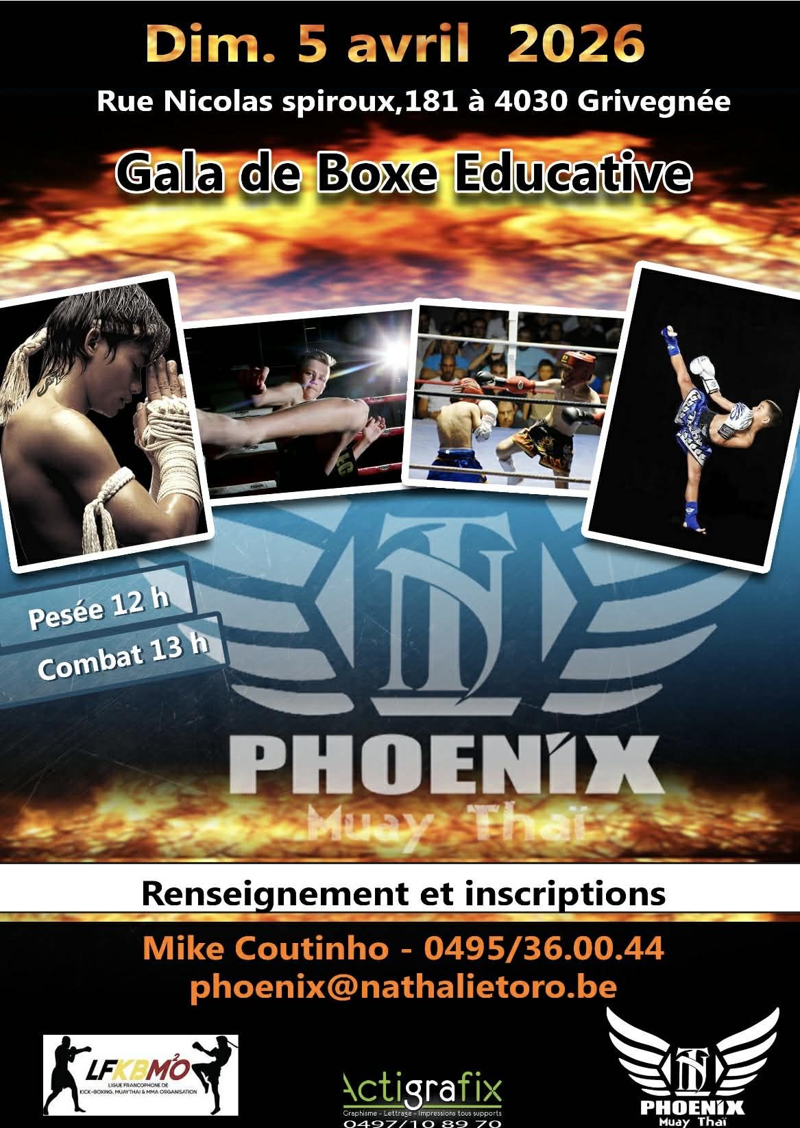 « Tous les Évènements Boxe éducative 5 avril 2026 « Boxe éducative + Gala B Gala B » Heure du gala : 13h Surface(s) : 1 surface + Google Agenda+ Exporter vers iCal Détails Date : 5 avril 2026 Catégorie d’Évènement: Boxe éducative Organisateur Nathalie Toro Téléphone : 0499267225 E-mail : phoenix@nathalietoro.be Lieu Grivegnée Rue Nicolas Spiroux, 181 Grivegnée, 4030 Belgique + Google Map
