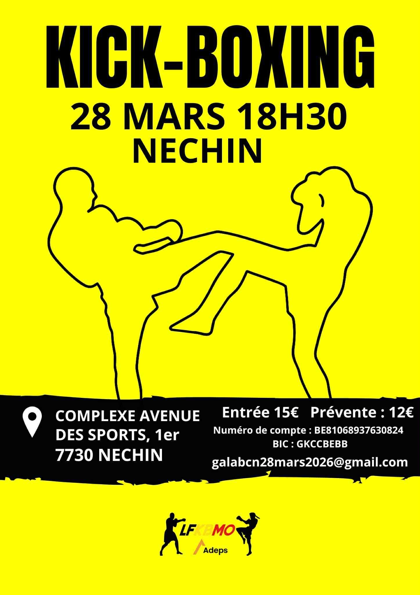« Tous les Évènements Gala C 28 mars 2026 « Boxe éducative Boxe éducative » Pesée de la veille : Non Heure de la pesée : 16h30 Heure du gala : 18h30 + Google Agenda+ Exporter vers iCal Détails Date : 28 mars 2026 Catégorie d’Évènement: Galas Organisateur Boxing Club Nechinois BCN Téléphone : 0033612252278 E-mail : bnechinois@gmail.com Lieu Nechin Av des Sports, 1 Nechin, 7730 + Google Map